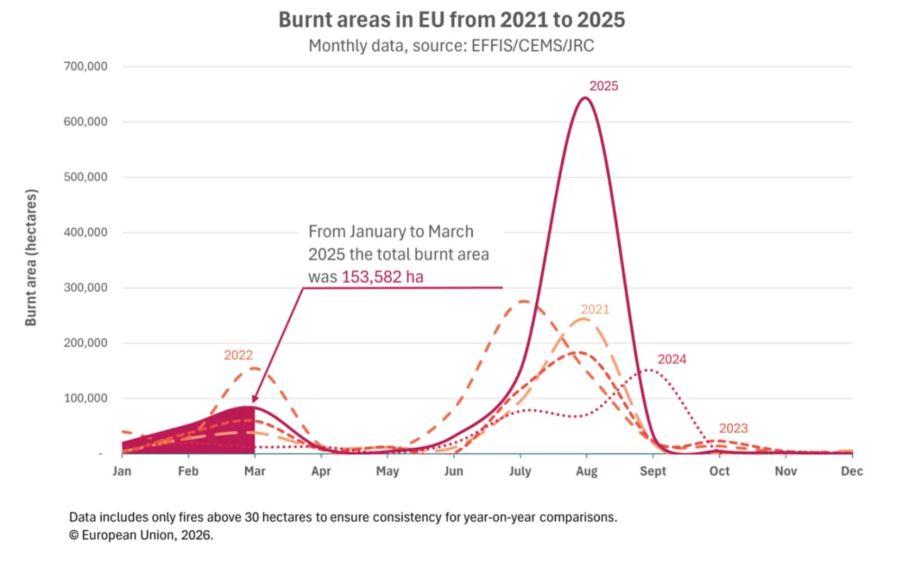 Erken Başlangıç: Mart ayı sonu itibarıyla AB içinde 100.000 hektardan fazla alan halihazırda yanmıştı