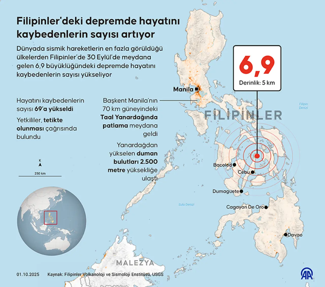 MANİLA (AA) - Pasifik Deprem Kuşağı'ndaki Güneydoğu Asya, art arda gelen sismik olaylarla sarsılmaya devam ediyor. Filipinler'in Davao Oriental eyaleti açıklarında meydana gelen 7.6 büyüklüğündeki deprem, tsunami uyarısına yol açarken, bölge ülkelerine "yıkıcı dalgalar" riski duyuruldu. Önceki hafta 6.9 büyüklüğündeki depremde 72 kişinin hayatını kaybettiği Filipinler'de bu yeni sarsıntı, hasar raporlarının gelmeye başladığı bir dönemde paniğe neden oldu.