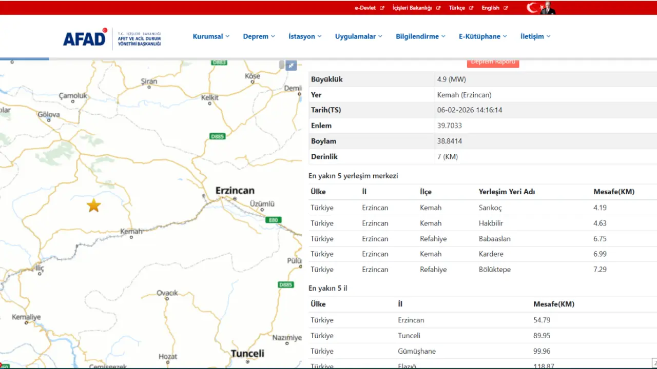 Afet ve Acil Durum Yönetimi Başkanlığı (AFAD), Erzincan’ın Kemah ilçesine bağlı Hakbilir köyü yakınlarında saat 14.16’da 4,9 büyüklüğünde bir deprem meydana geldiğini duyurdu.
