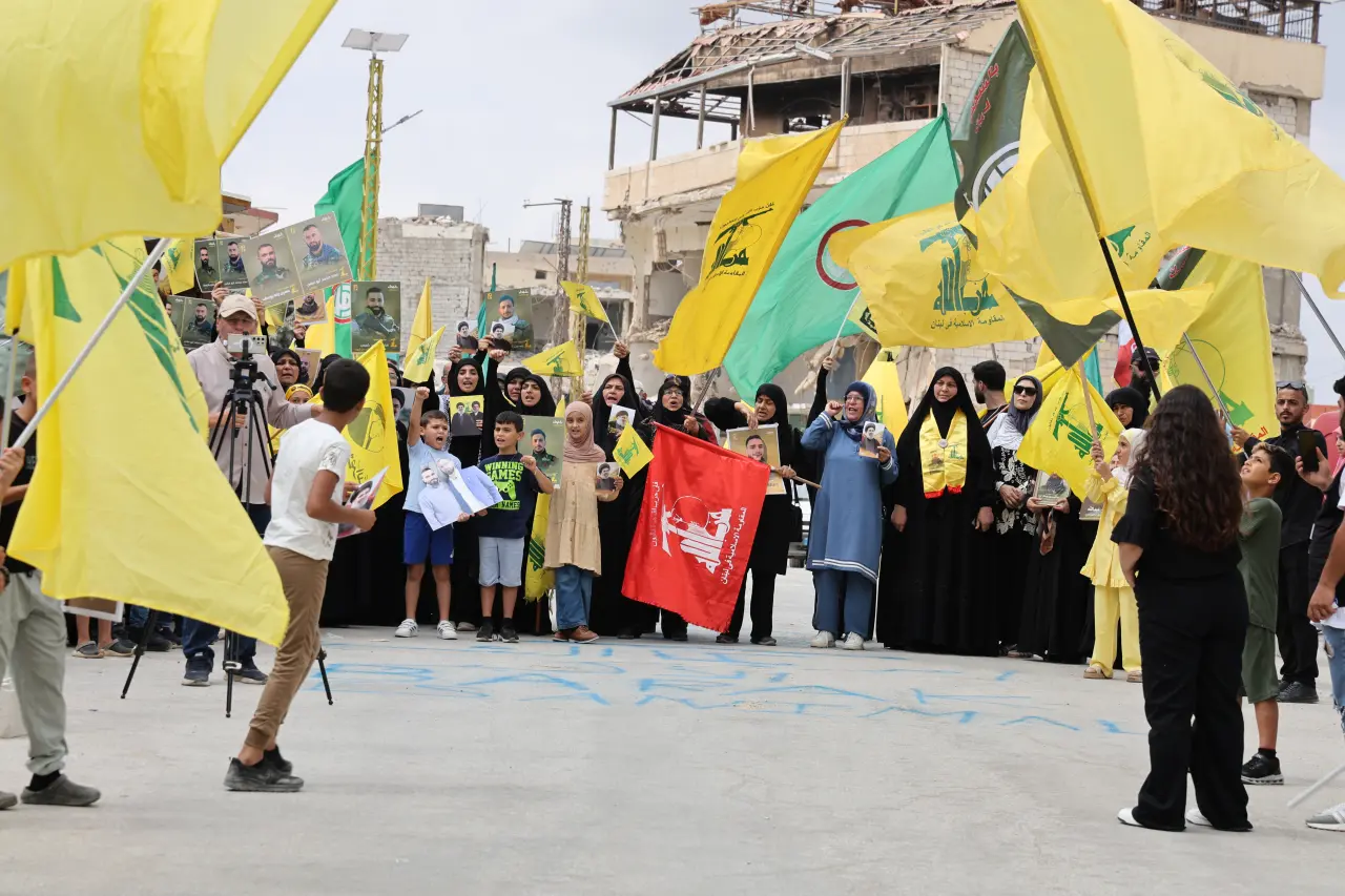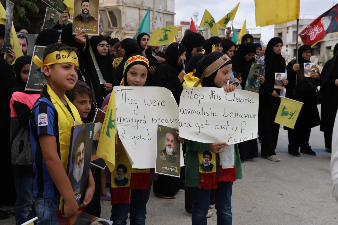 Hiyam beldesinde bir grup, Hizbullah bayraklarıyla protesto düzenledi. Göstericiler, "Amerika büyük şeytandır" yazılı pankartlar ve İsrail ordusunun kasabada öldürdüğü Hizbullah mensuplarının fotoğraflarını taşıdı.