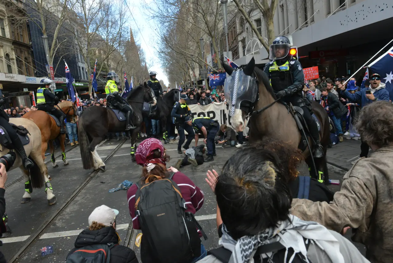 Melbourne kent merkezinde sabah erken saatlerden itibaren yoğun güvenlik önlemleri alan polis, iki grubun karşı karşıya gelmesini engellemekte zorlandı. Atlı polislerin de görev aldığı gösterilerde, biber gazı kullanılarak müdahalede bulunuldu ve bazı göstericiler gözaltına alındı. Gösteriler, saat 10.00’da başlayıp yaklaşık 6 saat sürdü ve polisin karşıt grupları farklı yönlere dağıtmasıyla sona erdi.