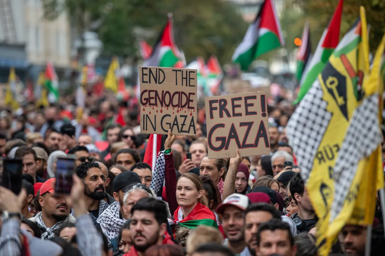 Göstericiler, Gazze’de sivillerin maruz kaldığı saldırılara son verilmesi, insani yardım koridorlarının açılması ve Alman hükümetinin İsrail’e verdiği siyasi desteği çekmesi yönünde sloganlar attı.