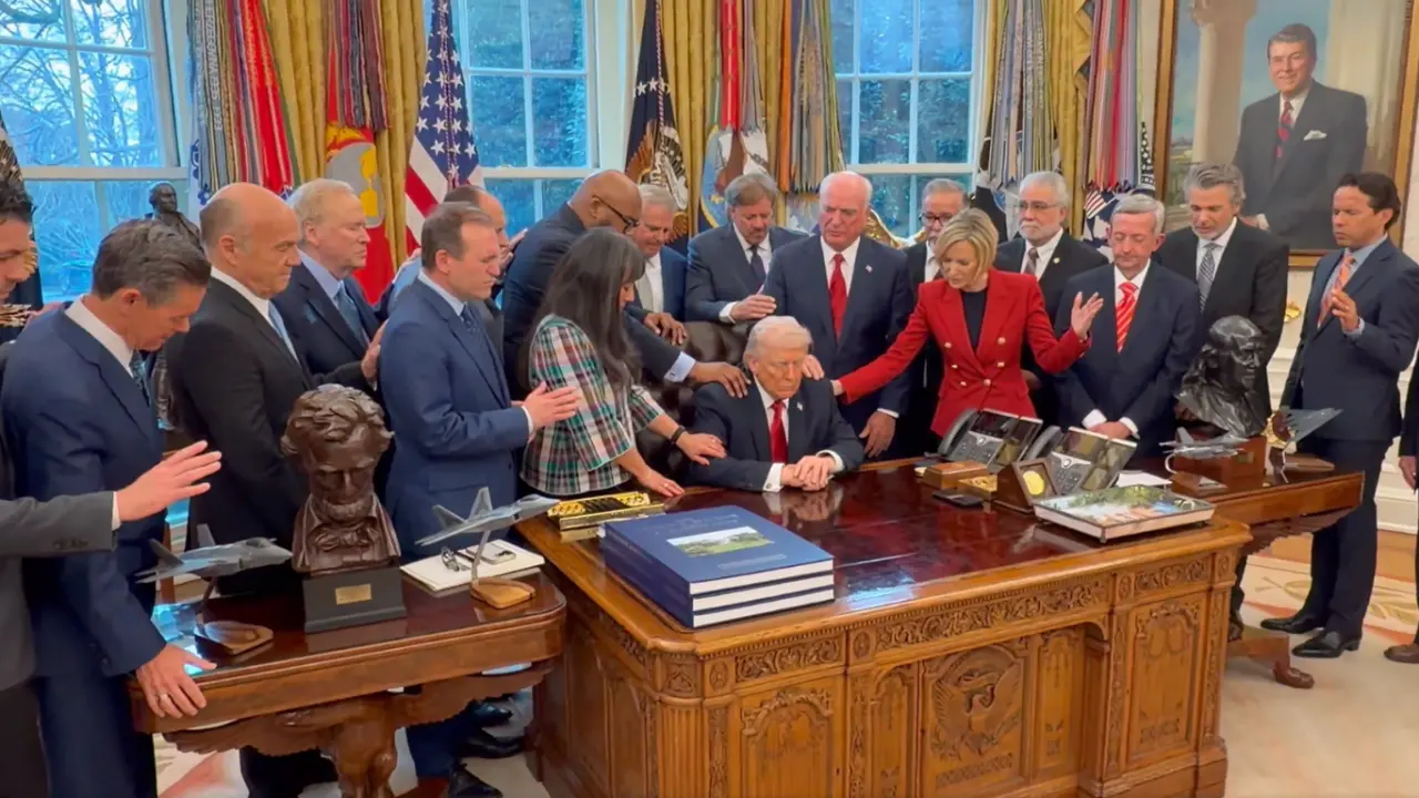 Trump’ın eski sosyal medya direktörü Dan Scavino tarafından “Happening Now” notuyla paylaşılan videoda, Başkan Trump’ın masasında oturduğu sırada çevresinde toplanan pastorların ellerini üzerine koyarak dua ettiği görülüyor.
