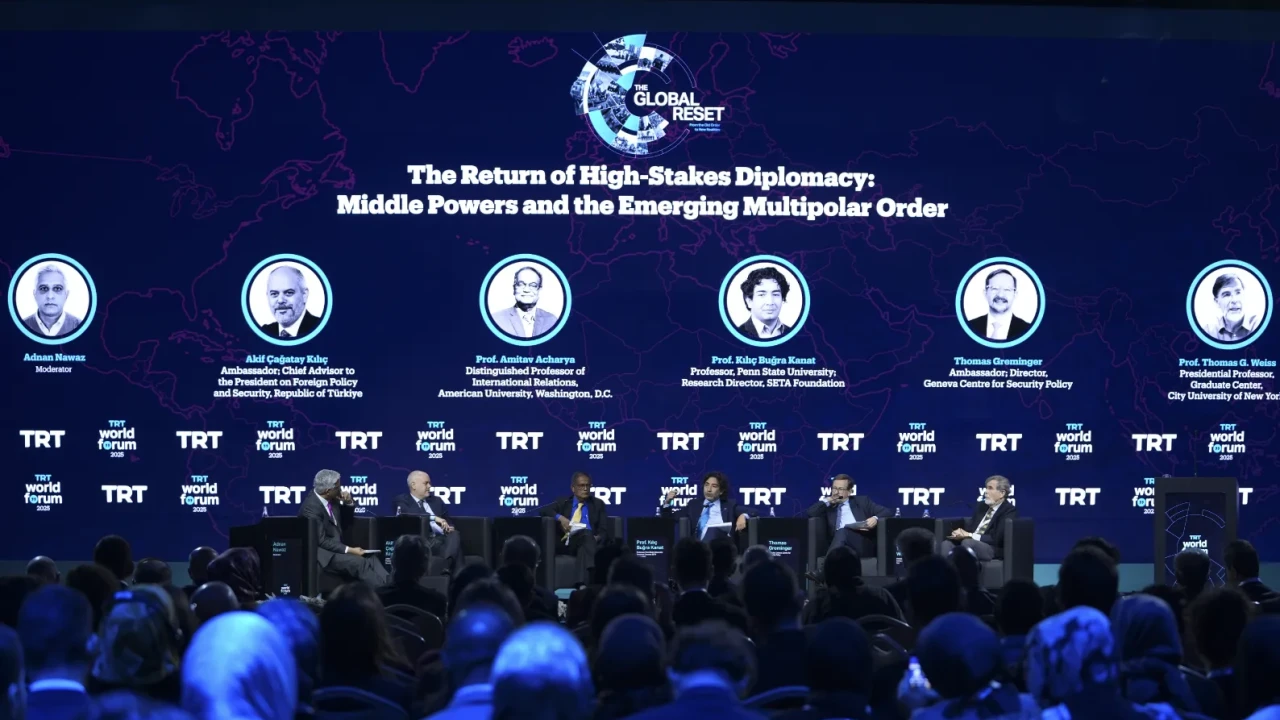 "Küresel Yeniden Kurulum: Eski Düzenden Yeni Gerçeklere" temasıyla düzenlenen forumun ikinci gününde, "Yüksek Riskli Diplomasinin Dönüşü: Orta Güçler ve Yükselen Çok Kutuplu Düzen" başlıklı oturum yapıldı. TRT World sunucusu Adnan Nawaz'ın moderatörlüğünde gerçekleştirilen panelde, Cumhurbaşkanı Dış Politika ve Güvenlik Başdanışmanı Akif Çağatay Kılıç, Amerikan Üniversitesi Uluslararası İlişkiler Profesörü Amitav Acharya, SETA Washington DC Araştırma Direktörü Kılıç Buğra Kanat, Cenevre Güvenlik Politikası Merkezi Direktörü Dr. Thomas Greminger ve New York Şehir Üniversitesi'nden (CUNY) Prof. Dr. Thomas G. Weiss konuşmacı olarak yer aldı.
