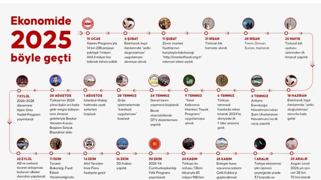 2025 yılı boyunca ekonomi alanında hayata geçirilen düzenlemeler, yatırımlar ve rekorlar dikkat çekti. Yıl boyunca ulaşımdan tarıma, savunma sanayisinden ticarete kadar birçok alanda önemli adımlar atıldı.