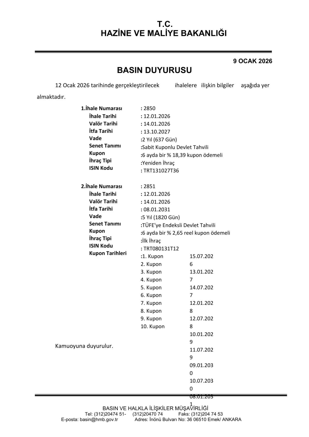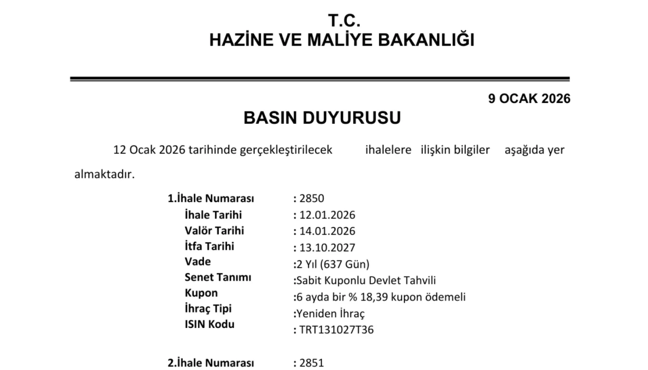 Yeniden ihraç tipiyle sunulan senetin ISIN kodu TRT131027T36.İkinci ihale (Numara: 2851) ise 5 yıllık (1820 gün vadeli) TÜFE'ye endeksli devlet tahvili kapsıyor. Valör tarihi 14 Ocak 2026, itfa tarihi 8 Ocak 2031 olan bu senet, 6 ayda bir %2,65 reel kupon ödemeli olacak. İlk ihraç olarak piyasaya sürülecek tahvilin ISIN kodu TRT080131T12. Kupon ödeme tarihleri şöyle: 15 Temmuz 2026, 13 Ocak 2027, 14 Temmuz 2027, 12 Ocak 2028, 12 Temmuz 2028, 10 Ocak 2029, 11 Temmuz 2029, 9 Ocak 2030, 10 Temmuz 2030 ve 8 Ocak 2031.