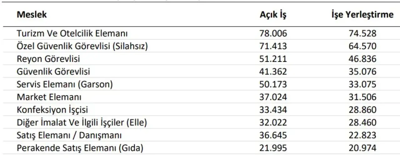 En çok açık iş bulunan meslekler ise “Turizm ve Otelcilik Elemanı”, “Özel Güvenlik Görevlisi (Silahsız)” ve “Reyon Görevlisi” olarak sıralandı.