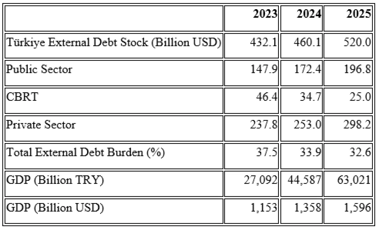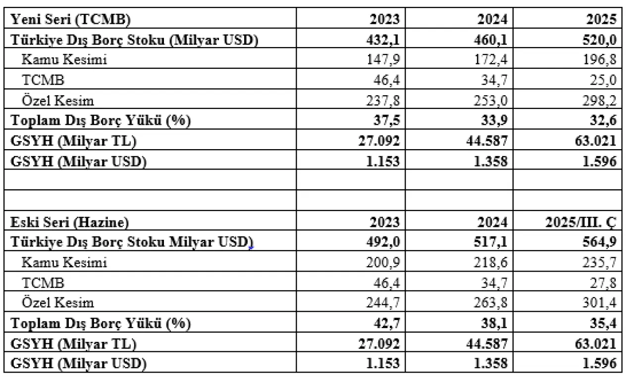 Hazine tarafından yayımlanan eski seride Türkiye’nin dış borç stoku 2025 yılının üçüncü çeyreği itibarıyla yaklaşık 565 milyar dolar görünürken, TCMB’nin yayımladığı yeni seride 2025 yılsonu itibarıyla dış borç stoku 520 milyar dolar olarak yer alıyor. Dış borçlanmanın arttığı bir dönemde son çeyrekte dış borç stokunun yaklaşık 45 milyar dolar daha düşük görünmesi, büyük ölçüde bu yöntem değişikliğinden kaynaklanıyor.