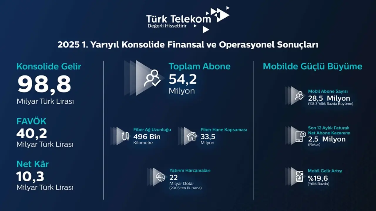 Türkiye’nin lider telekomünikasyon şirketi Türk Telekom, 2025 yılının ilk yarısına ait konsolide finansal ve operasyonel sonuçlarını bugün kamuoyuyla paylaştı. Şirket, güçlü büyüme performansıyla dikkat çekerken, hem gelirlerini artırdı hem de abone sayısında rekor seviyelere ulaştı. Türk Telekom CEO’su Ümit Önal, bu başarıyı değerlendirdi ve şirketin dijital dönüşüm vizyonunun meyvelerini verdiğini vurguladı.
