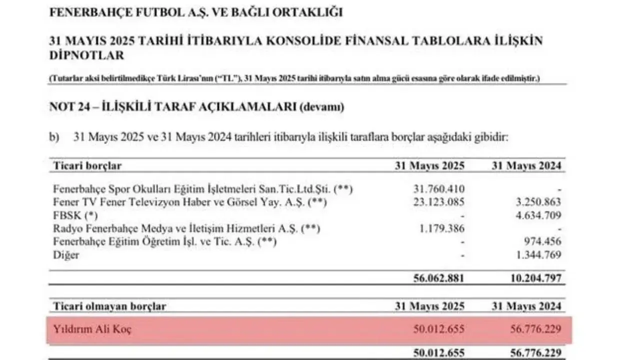 HaberTürk'ün haberine göre, Fenerbahçe'nin mali kayıtlarında yer alan bilgilere dayanarak, Koç'un kulübe verdiği 413 milyon TL'lik borcun büyük kısmı geri çekildi. 29 Şubat 2025 tarihli 9 aylık bilançoda 413 milyon TL olarak görünen borç, 31 Mayıs 2025 bilançosunda 50 milyon 12 bin TL'ye düşmüş durumda. Bu durum, Koç'un yaklaşık 360 milyon TL'yi geri aldığına işaret ediyor.