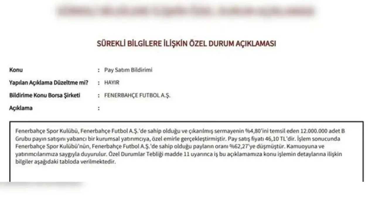 Bu gelişme, Fenerbahçe'nin Nisan 2025'te gerçekleştirdiği %4,8'lik hisse satışıyla da örtüşüyor.