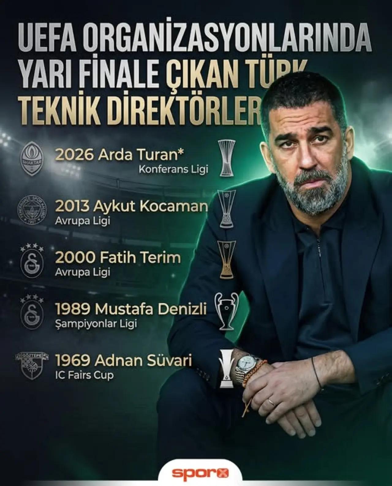 Shakhtar Donetsk'in başındaki Arda Turan, UEFA Konferans Ligi’nde takımını bir üst tura taşıması halinde Türk futbol tarihine geçecek. Turan, hem 13 yıl aradan sonra Avrupa’da yarı final gören ilk Türk teknik adam olacak hem de bu başarıyı yabancı bir takımla yaşayan ilk isim olarak tarihe adını yazdıracak.