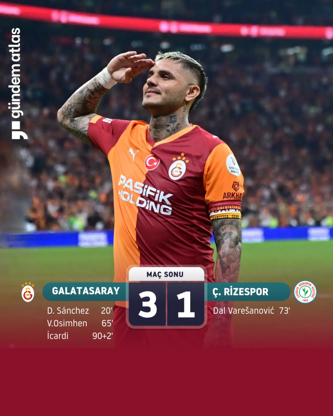 İkinci yarıda 65. dakikada Victor Osimhen farkı ikiye çıkarırken, 73. dakikada Dal Varešanović Rizespor’a umut verdi. Son sözü 90+2’de Mauro Icardi söyledi ve skoru belirledi.