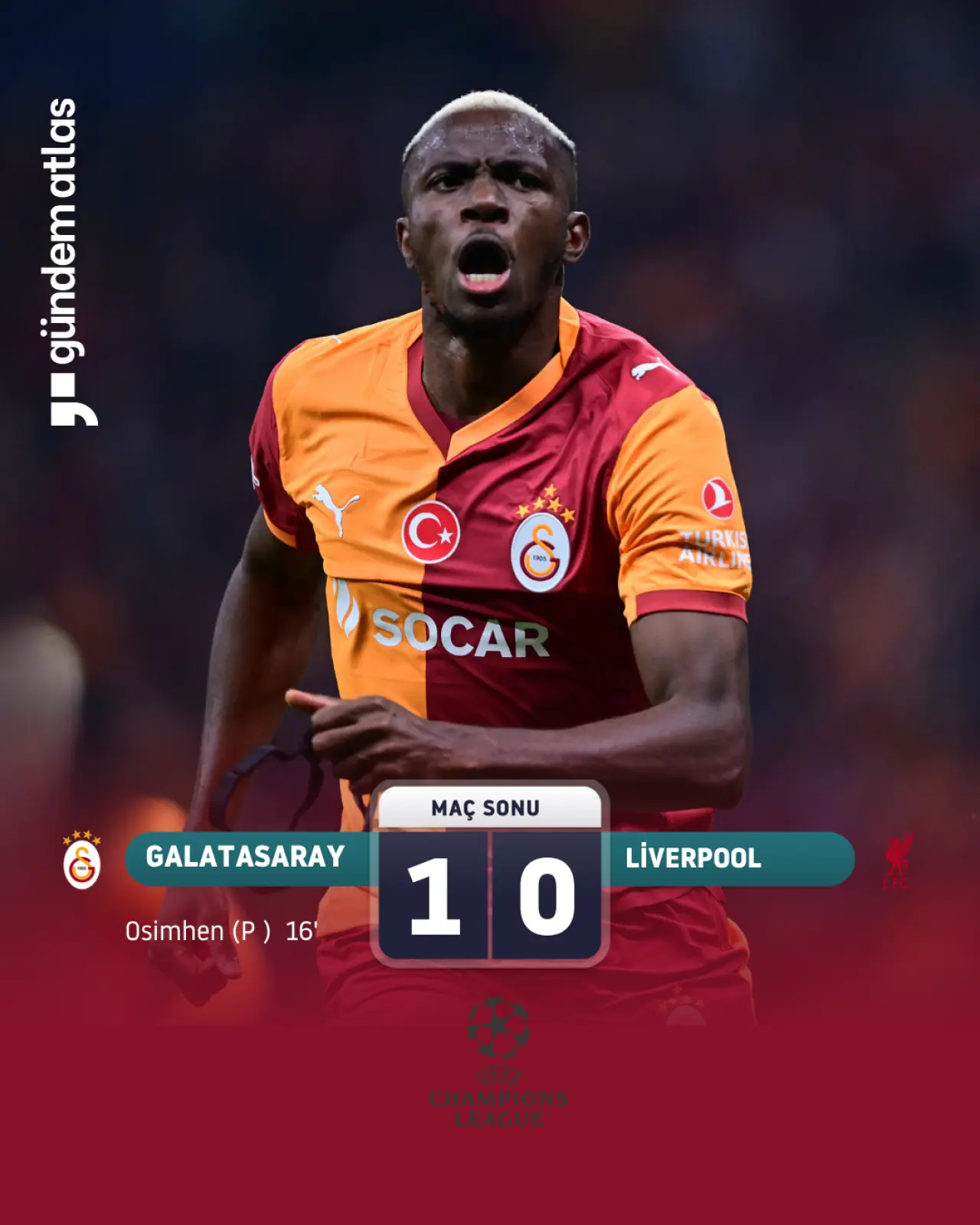 İSTANBUL (AA) – Galatasaray, UEFA Şampiyonlar Ligi ikinci hafta karşılaşmasında İngiliz devi Liverpool’u sahasında 1-0 mağlup ederek bu sezon Devler Ligi’ndeki ilk galibiyetini elde etti.