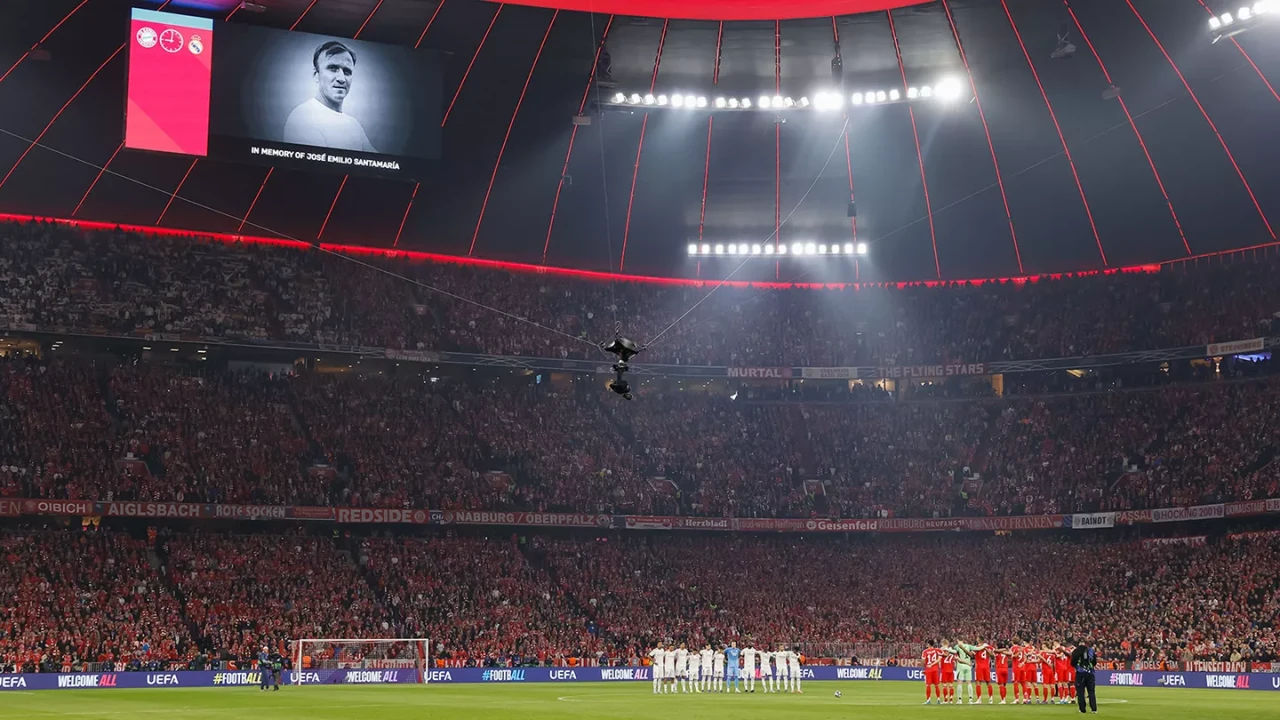 Münih’teki Allianz Arena’da, 96 yaşında hayatını kaybeden efsane futbolcu José Emilio Santamaría anısına bir dakikalık saygı duruşunda bulunuldu. Karşılaşmaya çıkan Real Madrid futbolcuları da sahaya siyah kol bantlarıyla çıktı.