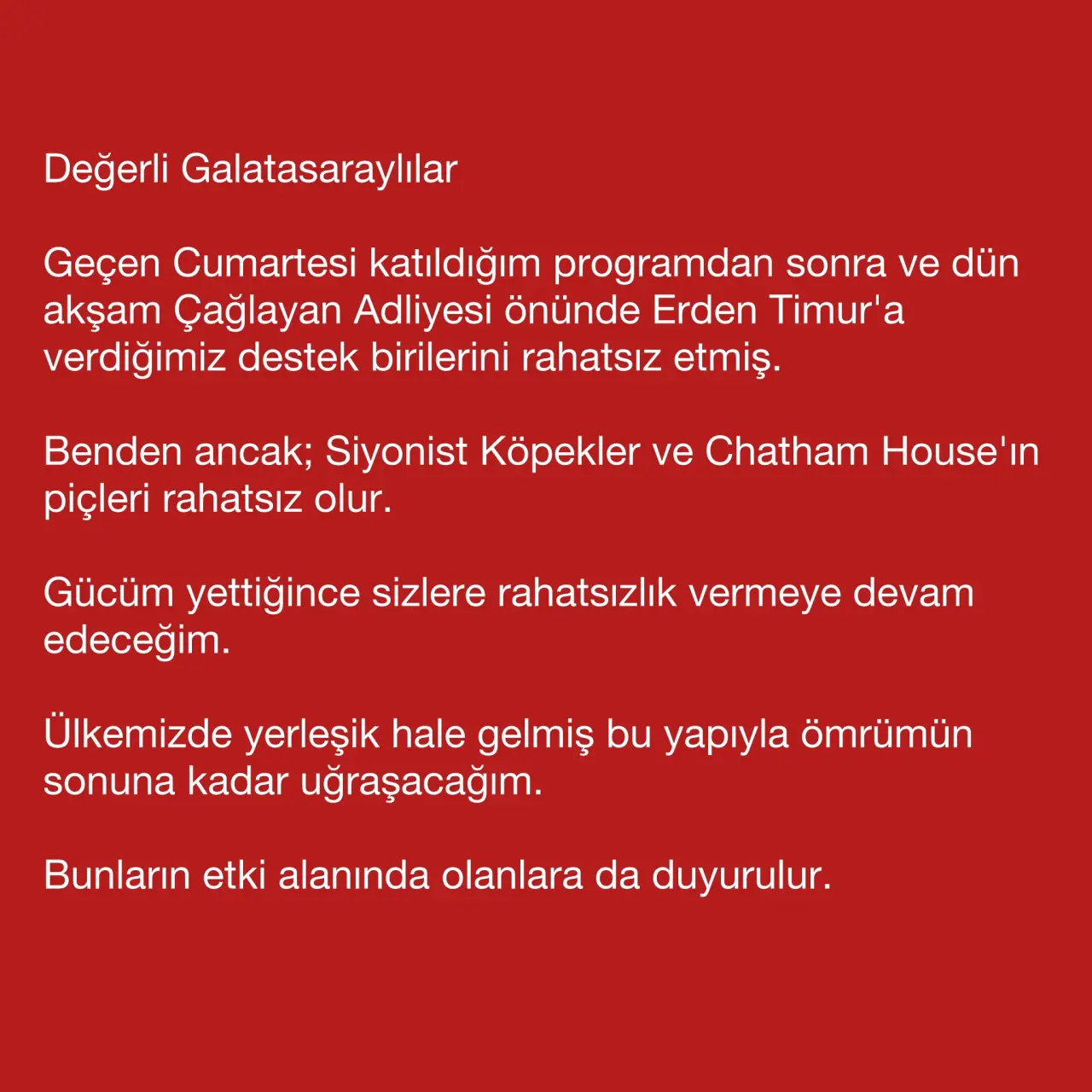 Tribün lideri, ülkede etkili olduğunu iddia ettiği bazı yapılarla ömrü boyunca mücadele edeceğini savunurken, bu çevrelerin etki alanında bulunanlara da mesaj verdiğini kaydetti.