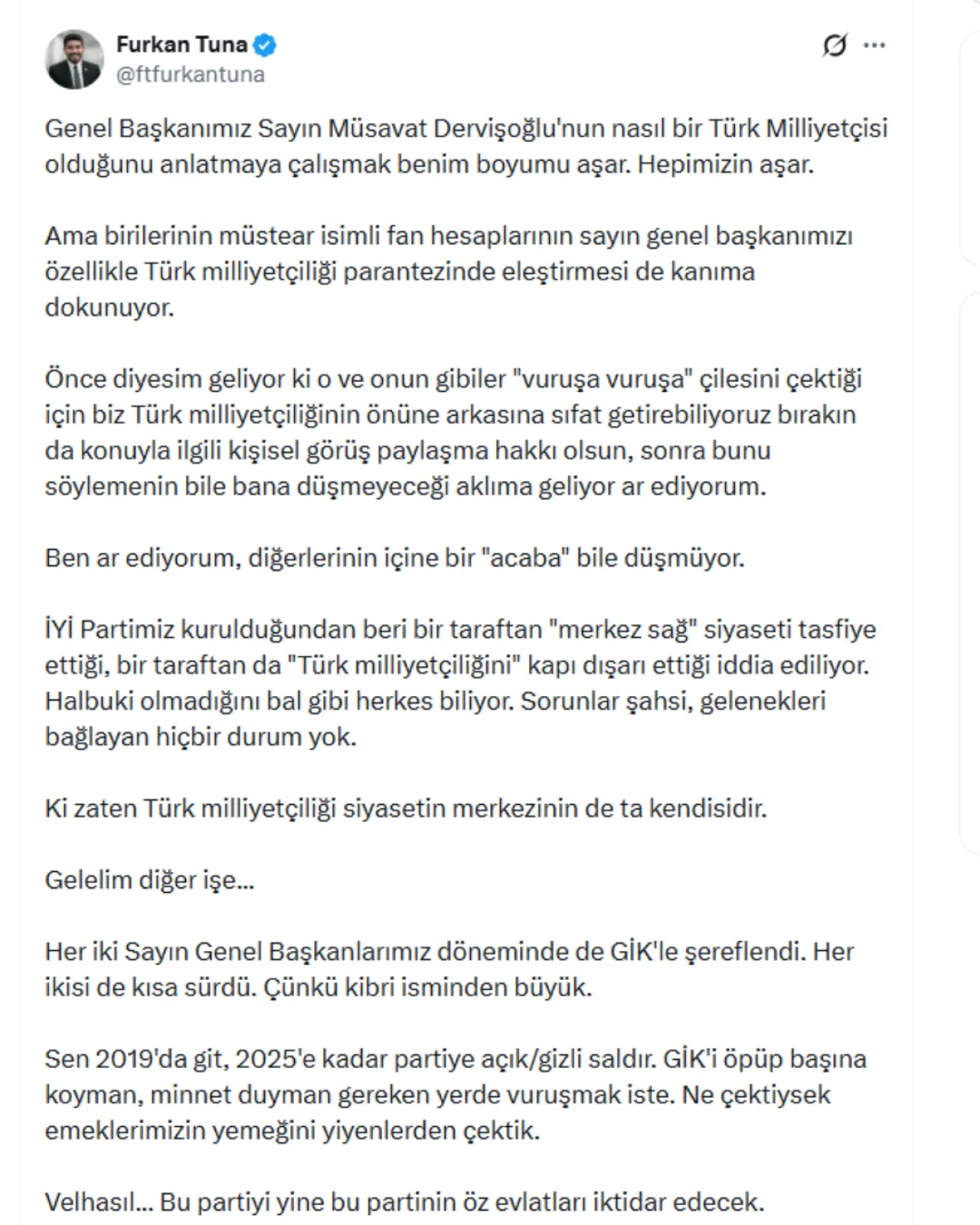 İYİ Parti Genel İdare Kurulu Üyesi Furkan Tuna, X hesabından yaptığı uzun paylaşımda Genel Başkan Müsavat Dervişoğlu’nu güçlü bir şekilde savundu ve Dinçaslan’ı isim vermeden ağır sözlerle eleştirdi.