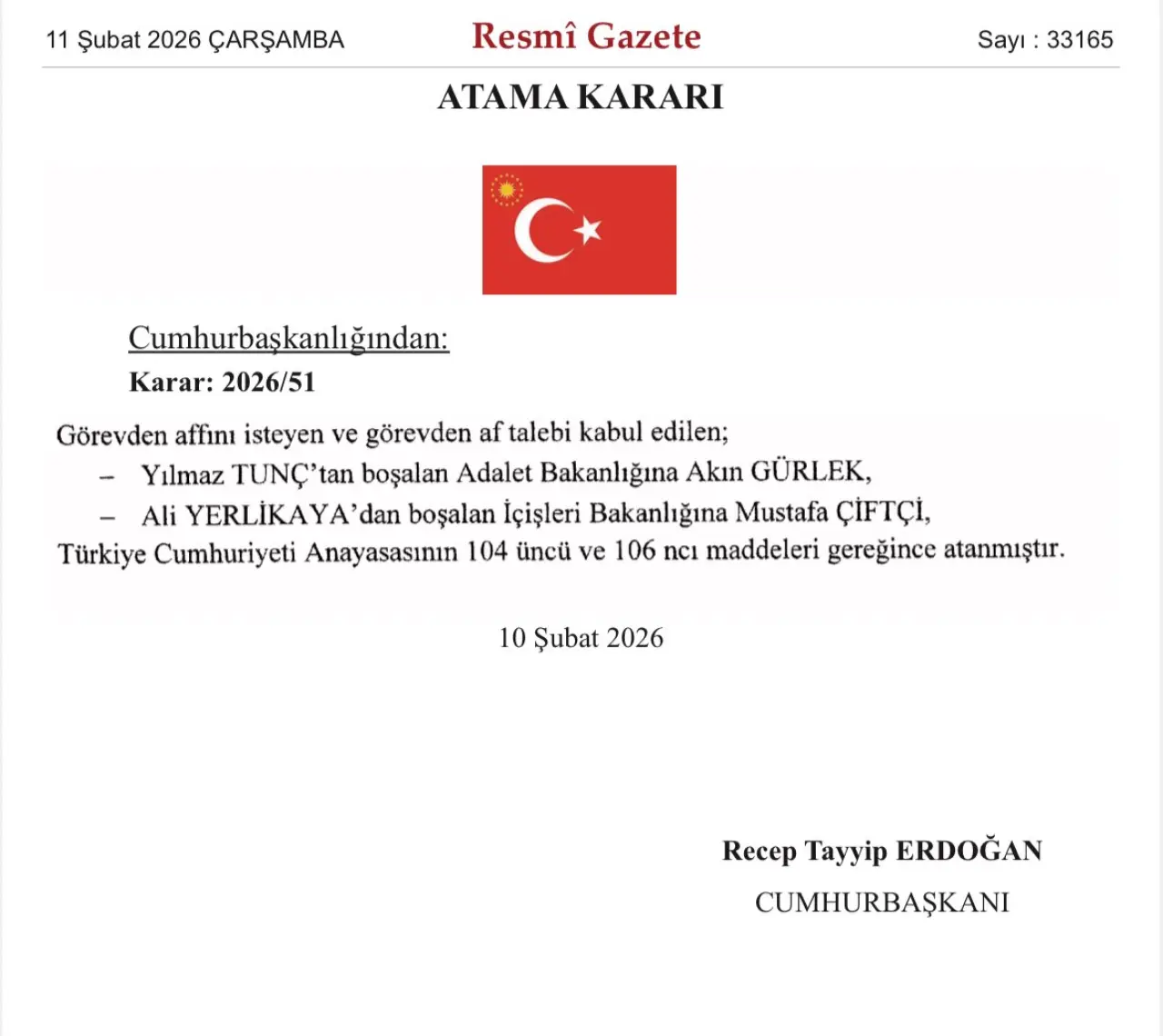 Cumhurbaşkanı Recep Tayyip Erdoğan’ın imzasıyla Resmi Gazete’de yayımlanan kararla kabinede iki kritik değişiklik yapıldı. Adalet Bakanı Yılmaz Tunç’un görevden affını istemesinin ardından yerine İstanbul Cumhuriyet Başsavcısı Akın Gürlek atanırken, İçişleri Bakanı Ali Yerlikaya’nın yerine ise Erzurum Valisi Mustafa Çiftçi getirildi.