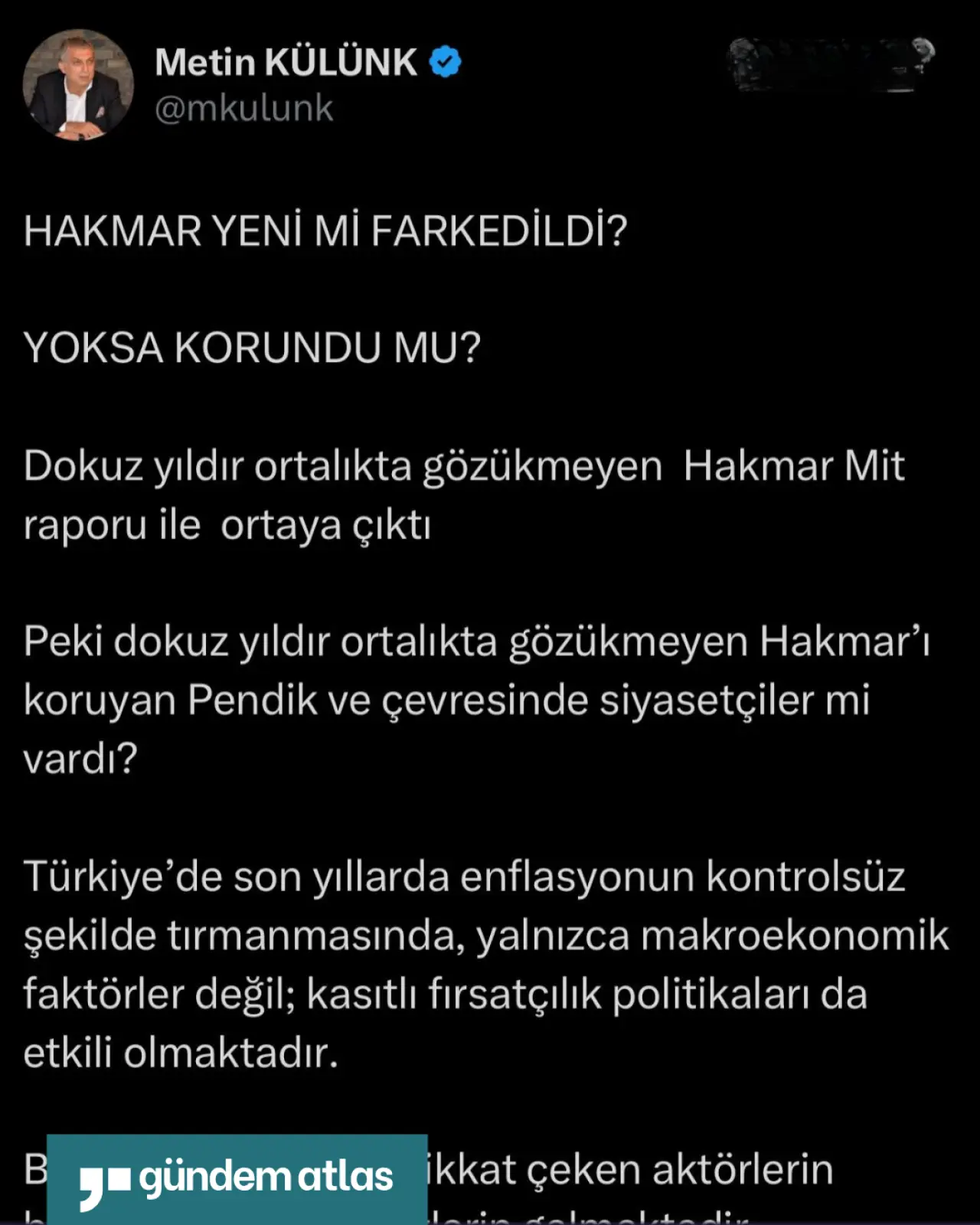 Paylaşımında Hakmar’a özel olarak yer veren Külünk, market zincirinin yıllardır görünmez olduğunu ve ancak yakın tarihte bir MİT raporuyla yeniden gündeme geldiğini öne sürdü. Hakmar’ın dokuz yıl boyunca Pendik ve çevresinde siyasi koruma altında olup olmadığının araştırılması gerektiğini vurgulayan Külünk, şu soruları gündeme taşıdı: