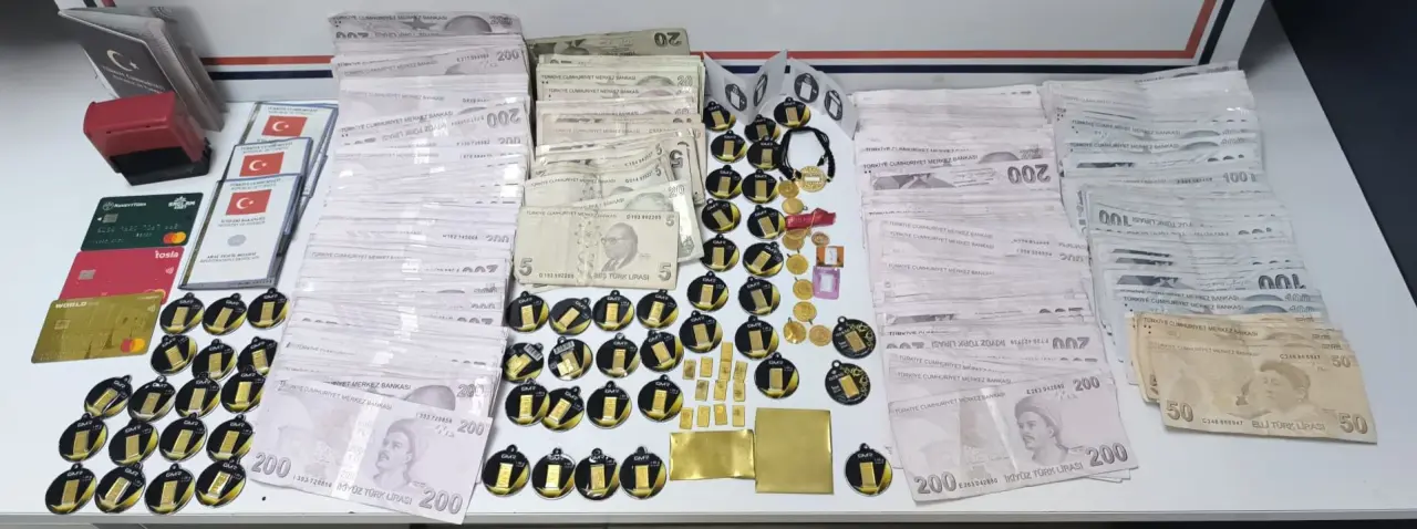 Polis, A.S.’nin aracında yaptığı aramada, suçtan elde edildiği değerlendirilen 112 bin 449 lira nakit para, 63 sahte 1 gram altın, 7 sahte çeyrek altın, kredi kartları, araç ruhsatları, pasaportlar, sahte kaşeler, 3 cep telefonu, flaş bellek, altın kalıpları ve boş altın keseleri buldu. Ayrıca, bölgedeki kuyumcularda bozdurulduğu tespit edilen 9 sahte altın da delil olarak dosyaya eklendi.