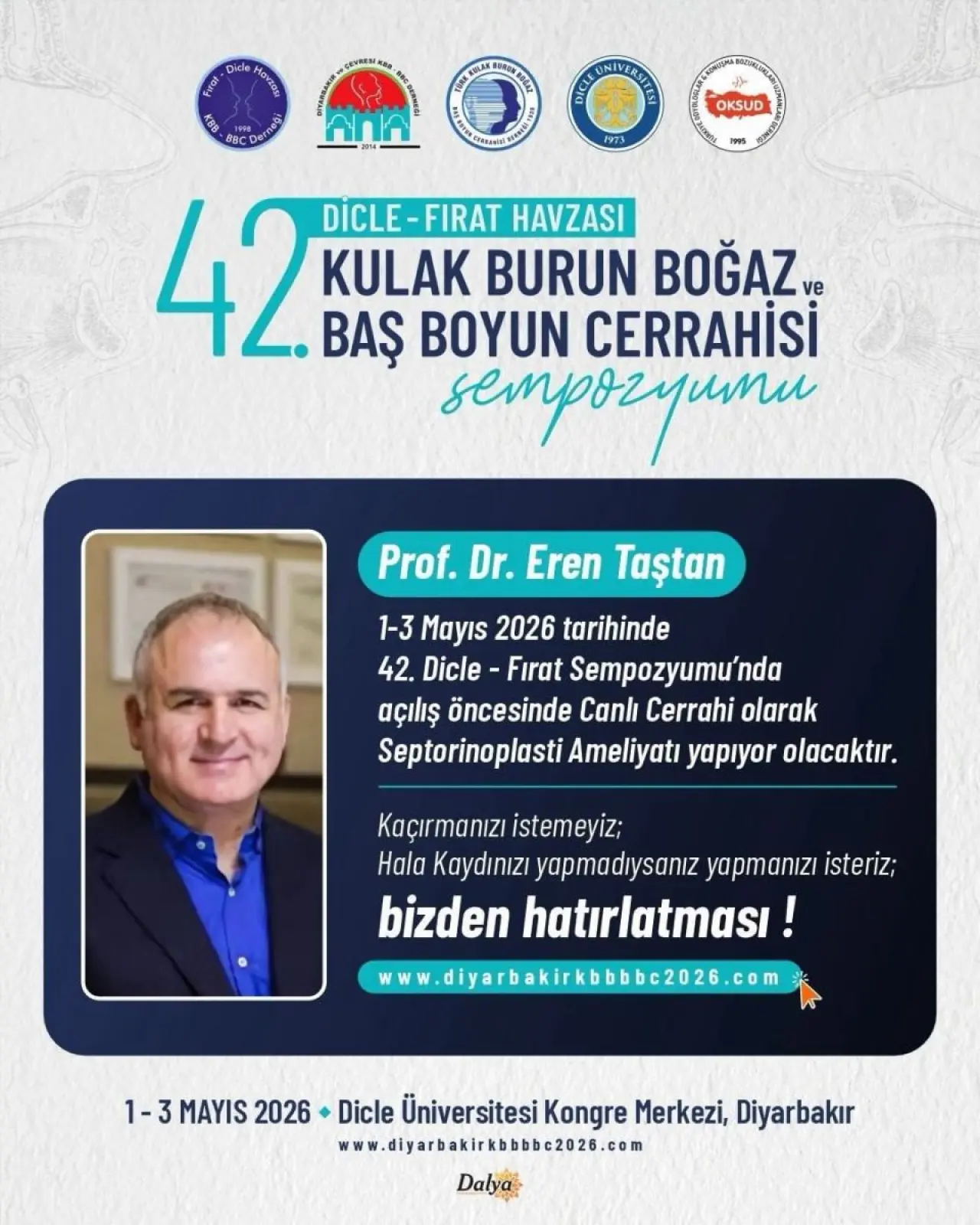 Dicle University ev sahipliğinde düzenlenecek 42. Dicle–Fırat Havzası Kulak Burun Boğaz ve Baş Boyun Cerrahisi Sempozyumu, 1–3 Mayıs 2026 tarihlerinde Diyarbakır’da gerçekleştirilecek.