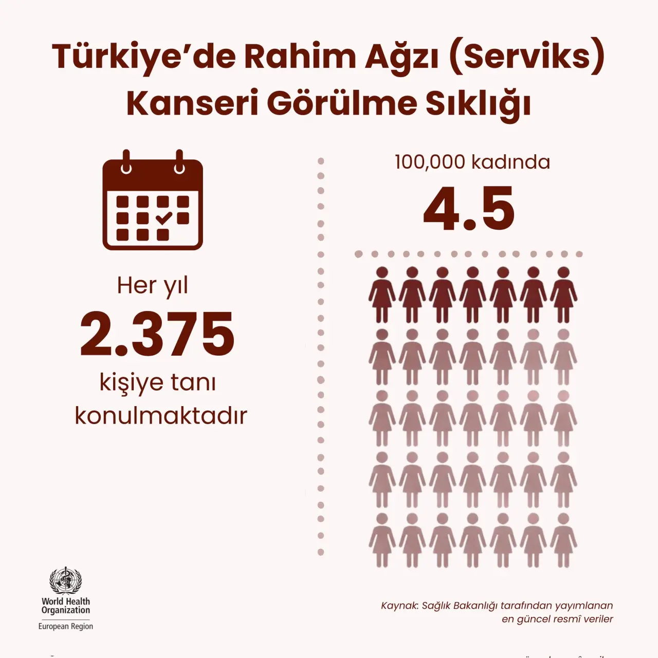 Sağlık Bakanlığı tarafından yayımlanan en güncel resmî verilere göre, Türkiye’de rahim ağzı kanseri görülme sıklığı 100 bin kadında 4,5 olarak kaydedilirken, her yıl yaklaşık 2 bin 375 kişiye bu tanı konuluyor.
