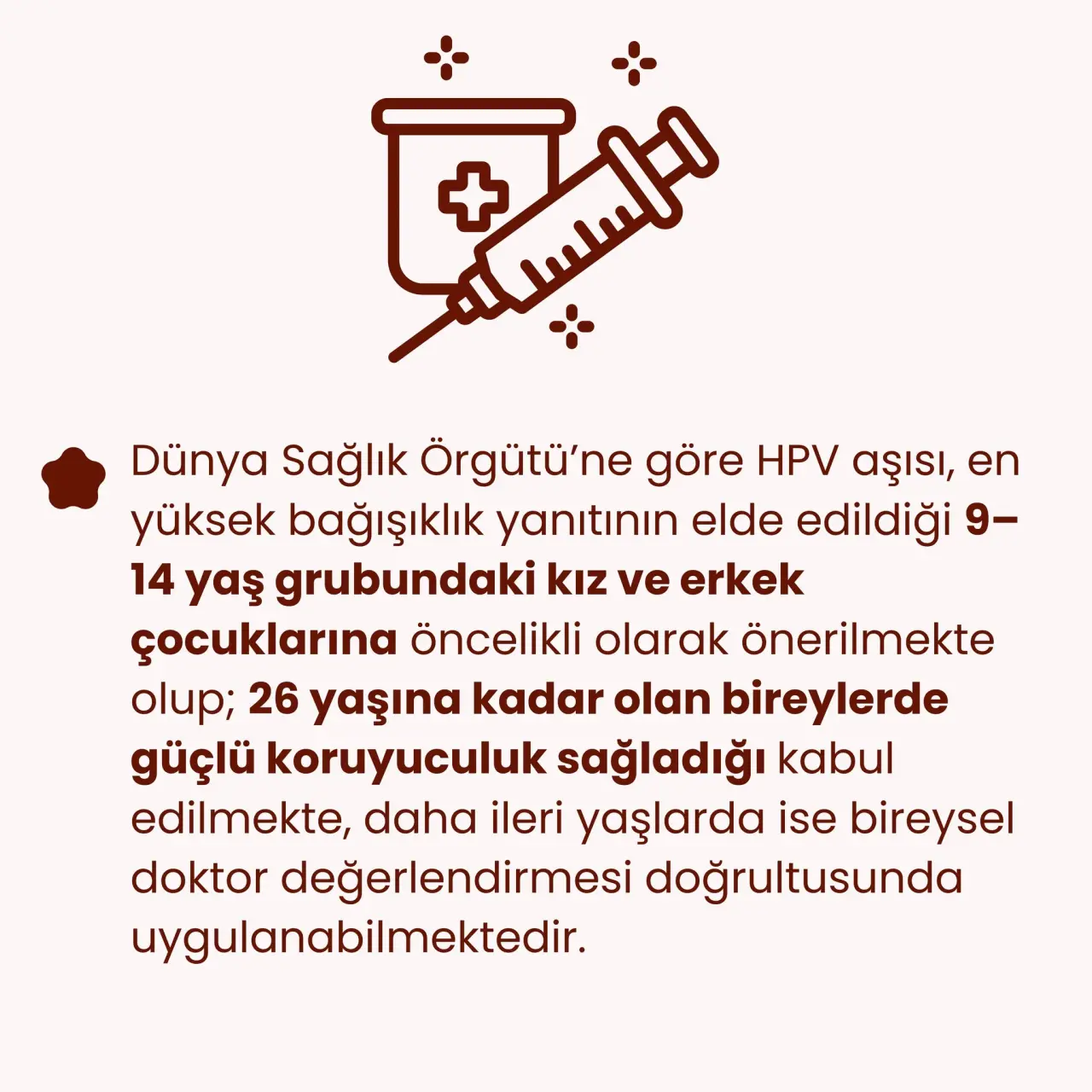 Dünya Sağlık Örgütü’ne (DSÖ) göre HPV aşısı, bağışıklık yanıtının en yüksek düzeyde elde edildiği 9–14 yaş grubundaki kız ve erkek çocuklara öncelikli olarak öneriliyor. Aşının, 26 yaşına kadar olan bireylerde güçlü koruyuculuk sağladığı, daha ileri yaşlarda ise bireysel doktor değerlendirmesi doğrultusunda uygulanabildiği kabul ediliyor.