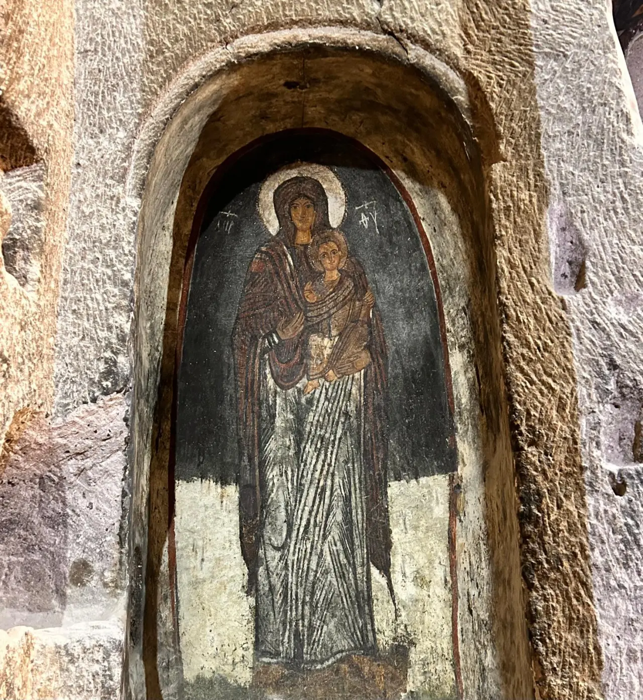 Manastırın merkezinde yer alan kilise, dört sütunlu, kapalı haç planlı yapısıyla dikkat çeker. Duvarlarında yer alan freskler, Bizans ikonografisinin Anadolu’daki en iyi örnekleri arasında gösterilir. Meryem Ana’nın kucağında İsa ile birlikte betimlendiği sahneler, sanatsal zarafeti ve renk canlılığıyla öne çıkar. Bu freskler, yüzyıllar boyunca kapalı kalması sayesinde özgün renklerini büyük ölçüde koruyabilmiştir.
