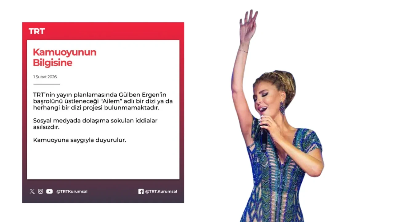 TRT tarafından yapılan yazılı açıklamada, yayın planlamasında Gülben Ergen’in başrolünü üstleneceği “Ailem” adlı bir dizi ya da herhangi bir dizi projesinin bulunmadığı net bir şekilde ifade edildi. Açıklamada, sosyal medyada dolaşıma sokulan iddiaların asılsız olduğu vurgulanarak kamuoyuna saygıyla duyuruldu.