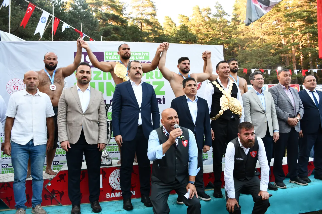 Final karşılaşmasında üstün performans sergileyen Feyzullah Öztürk, altın kemerini Vezirköprü Kaymakamı Özgür Kaya, Türkiye Geleneksel Güreşler Federasyonu Başkanı İbrahim Türkiş ve Vezirköprü Belediye Başkanı Murat Gül’ün elinden aldı.
