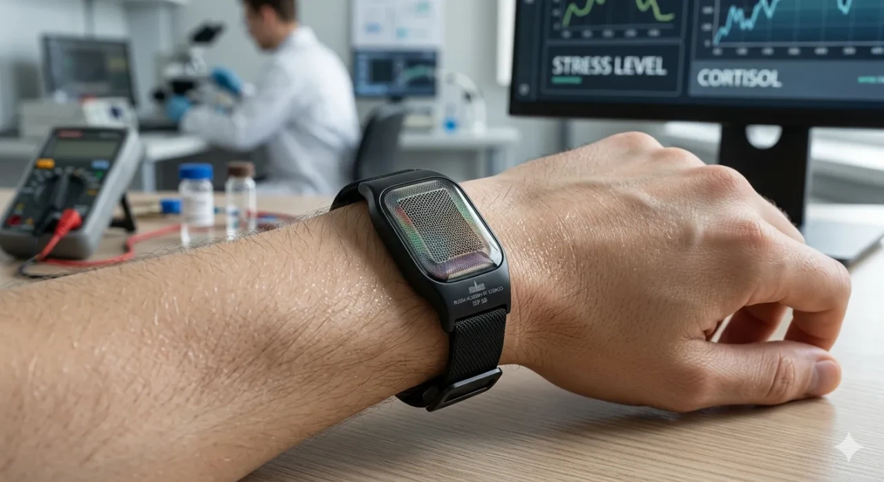 Rusya Bilimler Akademisi Sibirya Şubesi'ndeki Yarı İletken Fiziği Enstitüsü araştırmacıları, stres seviyesini cilt üzerinden anlık olarak ölçebilen giyilebilir bir sensör geliştirdi. Bileğe takılan bu cihaz, terdeki kortizol konsantrasyonunu yüksek hassasiyetle takip edebiliyor.