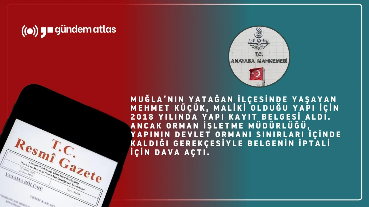 Muğla’nın Yatağan ilçesinde yaşayan Mehmet Küçük, maliki olduğu yapı için 2018 yılında yapı kayıt belgesi aldı. Ancak Orman İşletme Müdürlüğü, yapının devlet ormanı sınırları içinde kaldığı gerekçesiyle belgenin iptali için dava açtı.