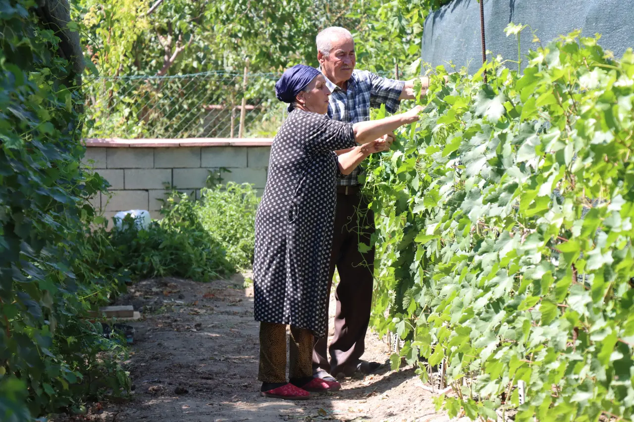 “Her sabah ezandan önce kalkarak bağda çalışıyorum. Gün boyu buranın içerisindeyiz. Ona göre Allah bize rızkımızı da sağlığımızı da veriyor. Biz buranın halkından, hepsinden çok razıyız. Allah hepsine rızık, selametlik versin. Bizlere ev verdiler, gaz verdiler. Elimizden geleni yapıyoruz. 75 yaşındayım ama kimseden geri de kalmıyorum.