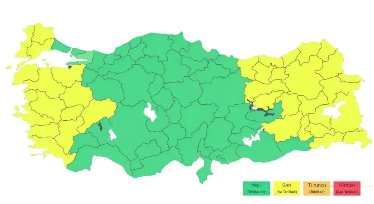 ANKARA (BHA) – Meteoroloji Genel Müdürlüğü (MGM), yurdun batısında beklenen sağanak ve fırtına ile doğu bölgelerindeki çığ tehlikesi nedeniyle 36 il için sarı kodlu uyarı yayımladı.