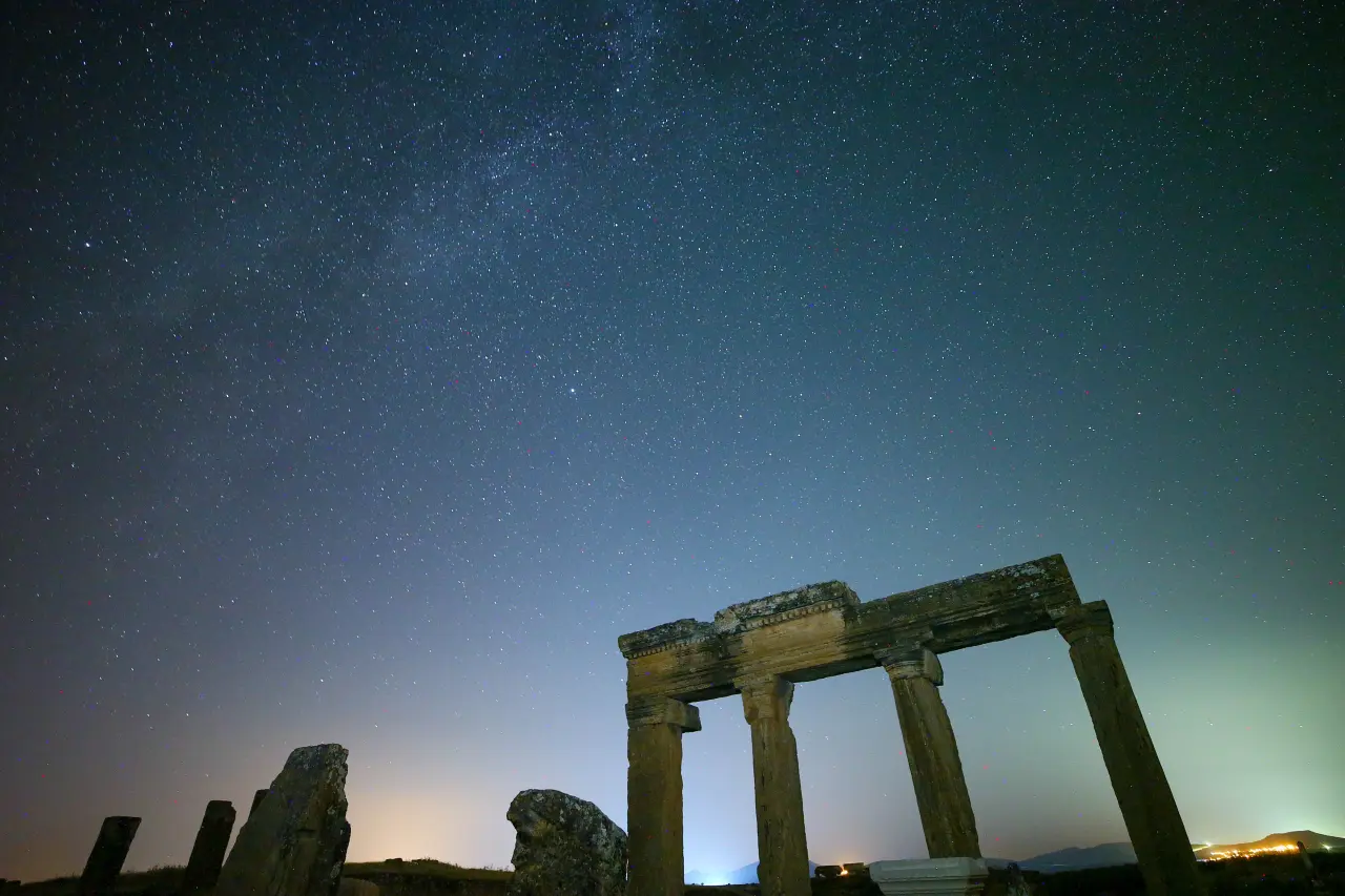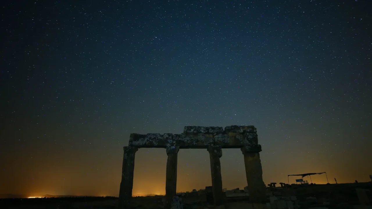 Büyük İskender’in Anadolu seferiyle Makedonya’dan gelenlerin yerleştiği, daha sonra Bergama Krallığı ve Roma İmparatorluğu’na bağlanan; derin vadilerle çevrili bir yarımada üzerinde kurulu Uşak’ın Ulubey ilçesindeki Blaundos Antik Kenti’ndeki yapılar ve yıldızlar, uzun pozlama tekniğiyle görüntülendi. Tarihi yapılar, yıldızlarla birlikte güzel görüntü oluşturdu.