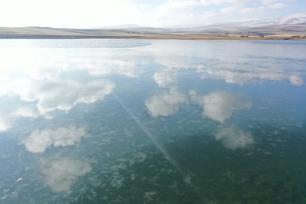 Kars-Ardahan sınırında bulunan Türkiye’nin en büyük ikinci tatlı su gölü Çıldır Gölü’nde soğuk hava etkisiyle yüzey donmaya başladı. Gece sıcaklıkların sıfırın altında 10 dereceye kadar düştüğü bölgede, 123 kilometrekarelik gölün özellikle Taşbaşı köyü mevkisindeki kenar kısımları buz tuttu. Donmayan bölümlerde ise ördek ve sakarmeke kuşları yiyecek aramaya devam ediyor.
