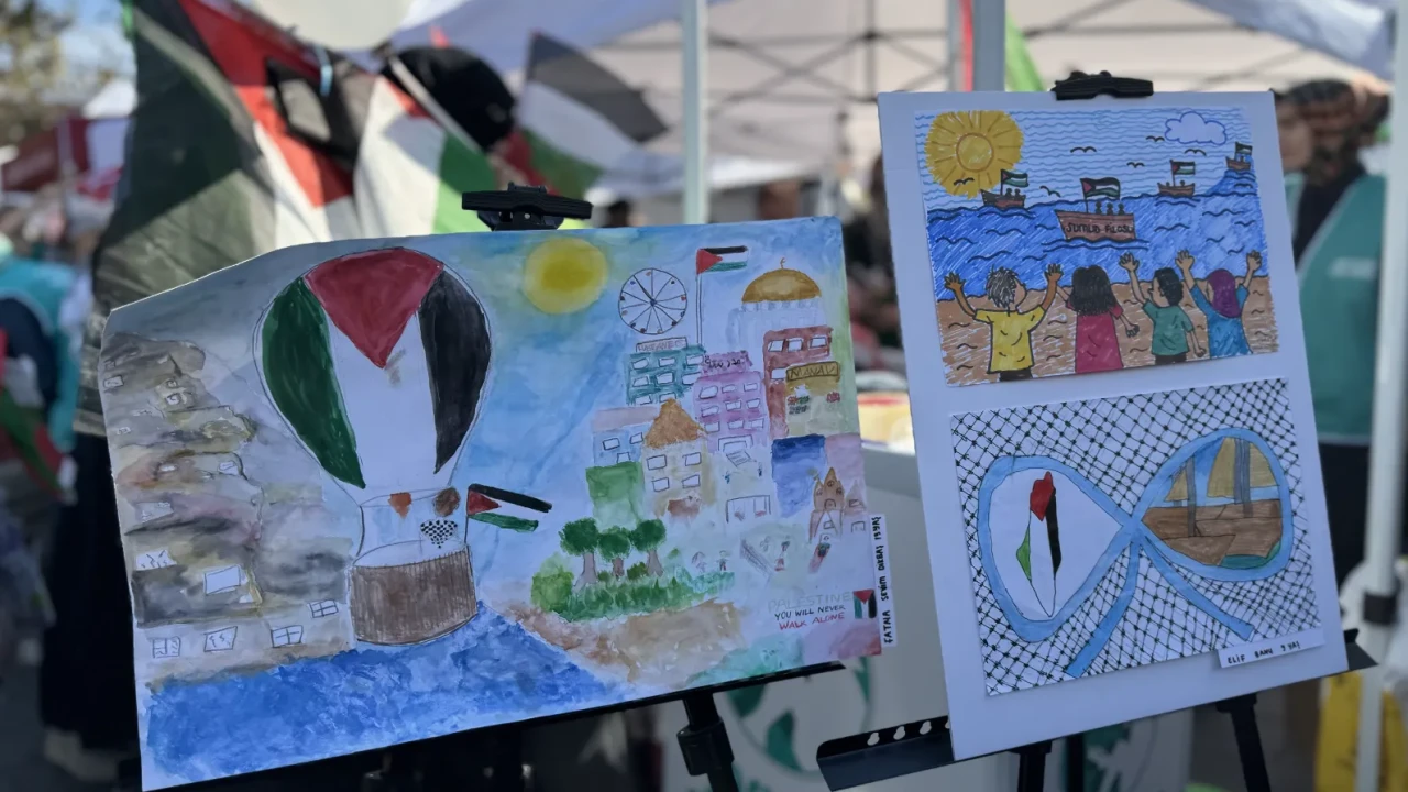 “Filistin ve Gazze soykırımına ilişkin düzenlediğimiz resim yarışmasına katılan çocukların eserlerinden seçtiklerimizi bugün burada sergiliyoruz. Jürinin seçtiği resimler, düzenleyeceğimiz müzayedede bağış karşılığında satılacak.”