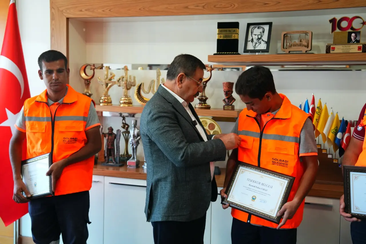 Gölbaşı Belediye Başkanı Yakup Odabaşı, bu duyarlı davranışı gösteren temizlik personeli Şenol Özdemir, Benan Polat ve Yalçın Taraz’ı makamında ağırlayarak teşekkür belgesi ve altın hediye etti. Odabaşı, personelin sergilediği davranışın belediyecilik anlayışlarının bir yansıması olduğunu vurgulayarak,