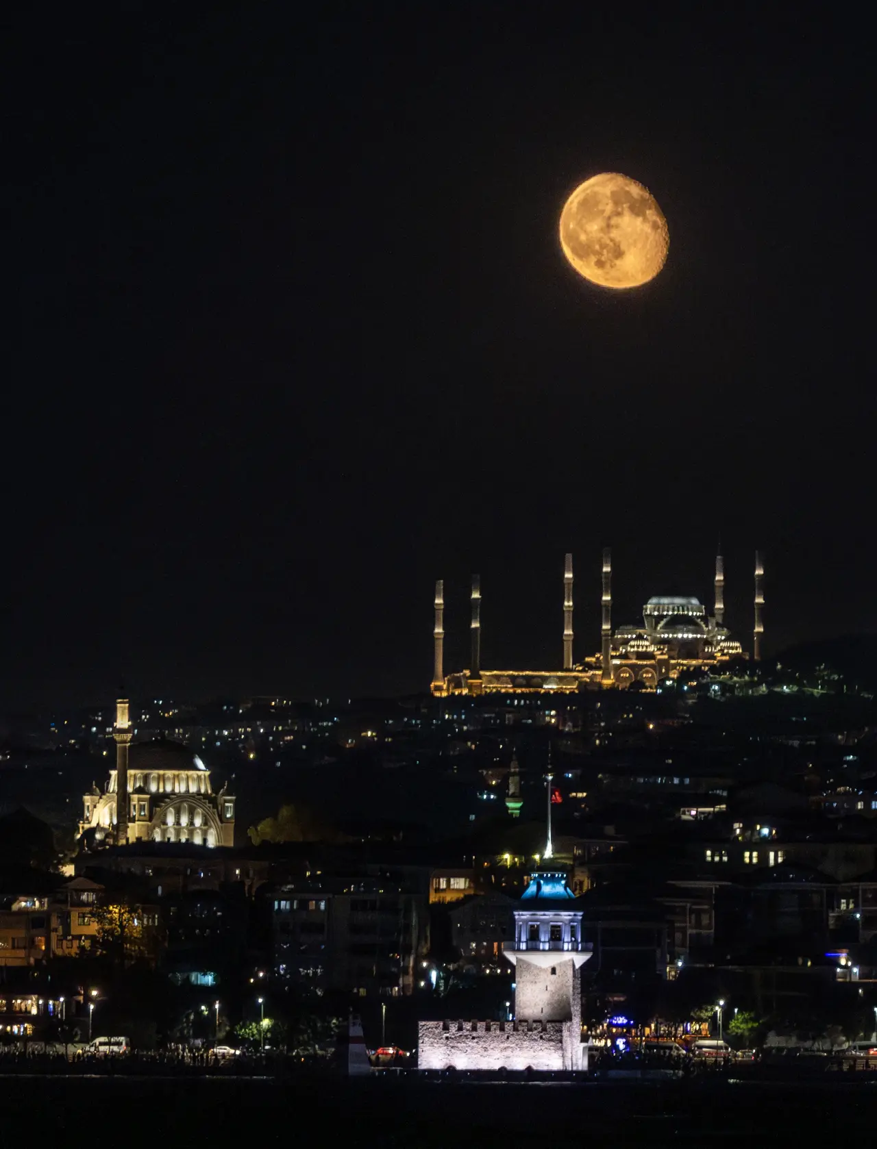 Ay’ın dolunaydan hemen sonraki şişkin evresi, Kız Kulesi, Ayazma Camisi ve Büyük Çamlıca Camisi’nin siluetleriyle aynı karede yer alarak şehrin siluetine eşsiz bir estetik kattı.