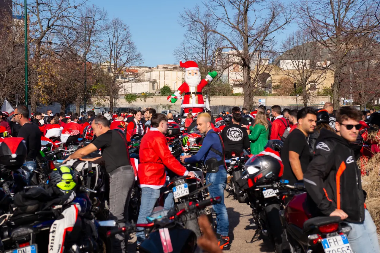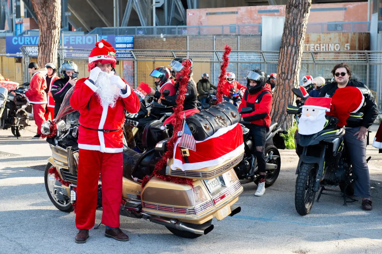 İtalya’nın Napoli kentinde Noel Baba kostümü giymiş motosikletçiler, şehrin sokaklarında düzenlenecek geleneksel geçit töreni için Diego Armando Maradona Stadyumu önünde bir araya geldi.