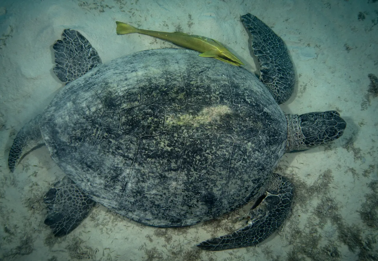 Şahin gagalı kaplumbağa resif çevresinde beslenirken görüntülenirken, yeşil deniz kaplumbağasının yanında remora balıkları yüzüyordu. Remora’lar, kaplumbağanın derisindeki parazitleri temizleyerek besleniyor; bu karşılıklı fayda sağlayan ilişki simbiyotik olarak tanımlanıyor.