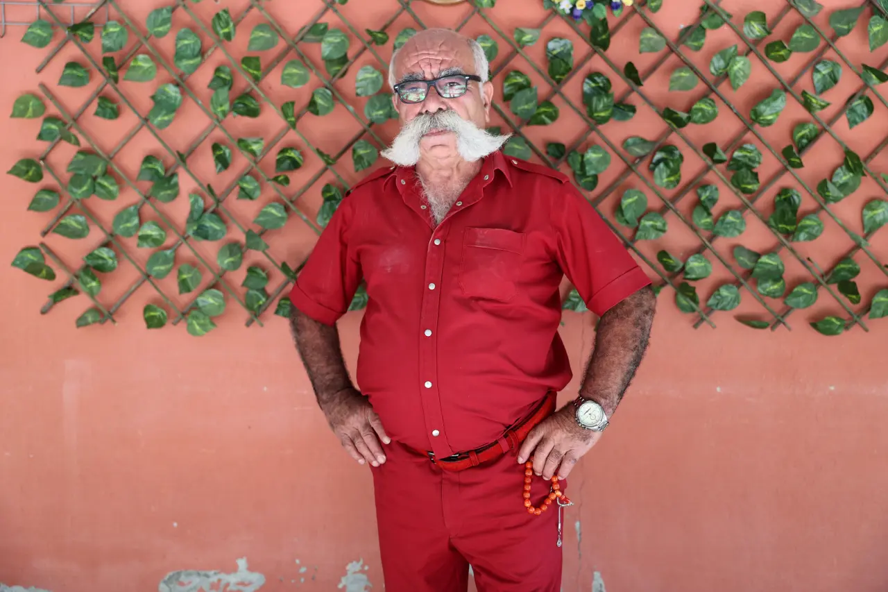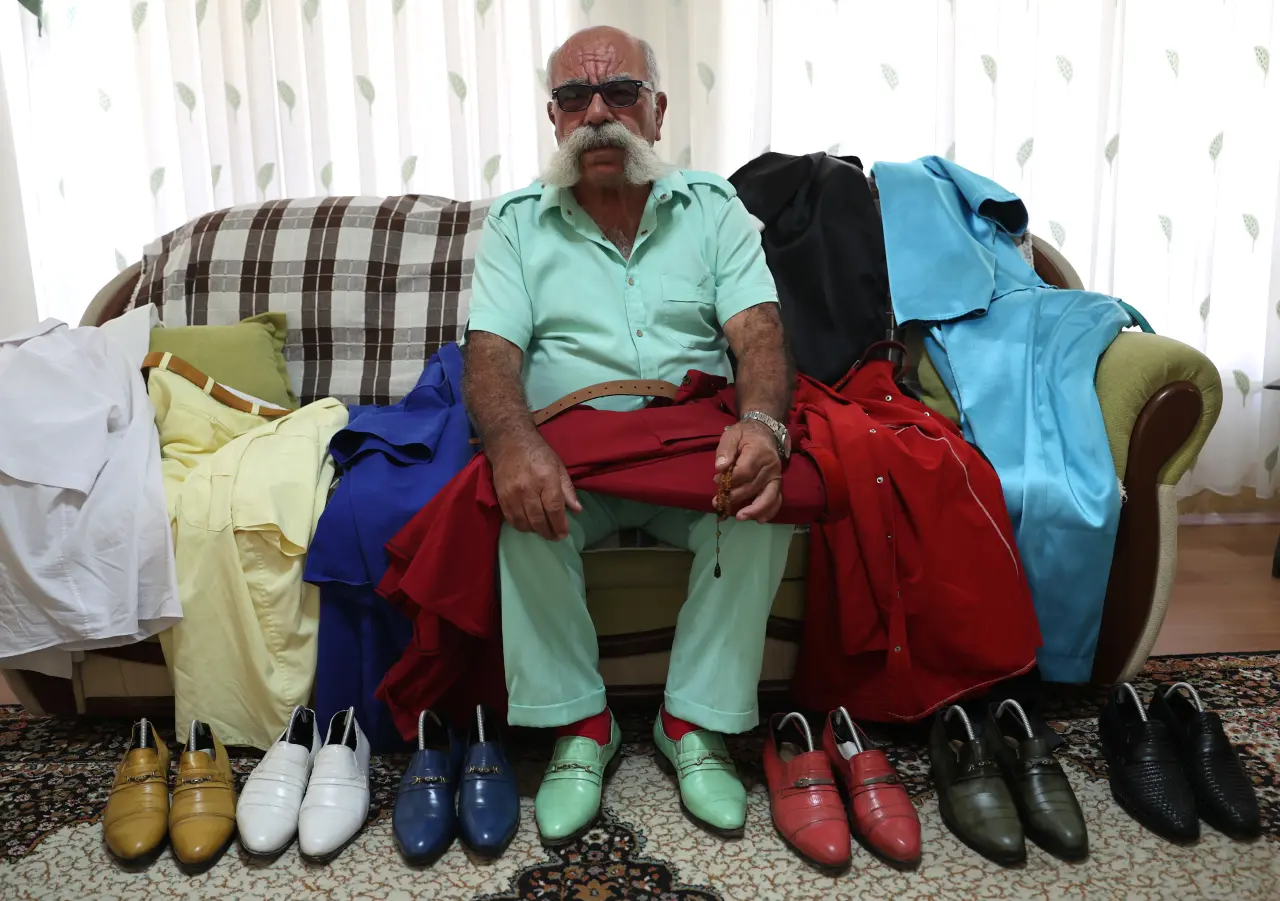 “50 yıldır böyle giyiniyorum. Renkli giyinince daha mutlu oluyorum. Bir ortama girince insanlar bana bakıyor. Baktıklarını hissedince bıyığımı da şöyle bir sıvazlarım, dünyanın malına değiyor. Bıyığım bir buçuk metre uzunluktaydı. 1992 yılında Köy Hizmetleri’nde yol yapımında çalışmaya başlayınca kesmiştim. 13 yaşından beri renkli giyerim, bu bir heves. Kot pantolon ve tişört filan versen giyemem. İllaki böyle renkli takım olacak. Eskiden ağabeylerim Almanya’dan izne gelince güzel giyinirlerdi. Ben de onlara heveslendim ve kendime elbise diktirmeye başladım. Yol yapımında çalıştığım sırada bile iş bitince tulumumu çıkarıp elbiselerimi giyerdim. Elbiselerimi giyince hiç yorgunluğum kalmazdı. Başka bir kıyafet giyemem. Bağda bahçede çalışırken bile böyle giyinirim. Kirlenirse bir daha diktiririm. Şimdi mor renkte kıyafet ve ayakkabı diktireceğim. Sipariş verdim kumaşı bekliyorum. Renkli kumaşlara hiç dayanamam. Allı, yeşilli iyi olur. En sevdiğim renk kırmızı. Ben Hacıbektaşlıyım kırmızı olsun, beş fazla olsun.”