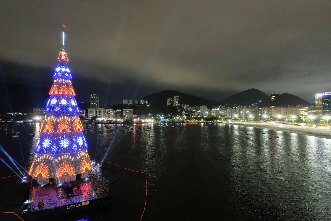 Brezilya’nın Rio de Janeiro kentinde geleneksel yılbaşı kutlamalarının sembolü haline gelen dev yılbaşı ağacı, Botafogo Plajı açıklarında ışıklandırıldı. 80 metre yüksekliğindeki yüzen ağaç, 2,3 milyon LED ışıkla süslenerek geceyi adeta gündüze çevirdi.