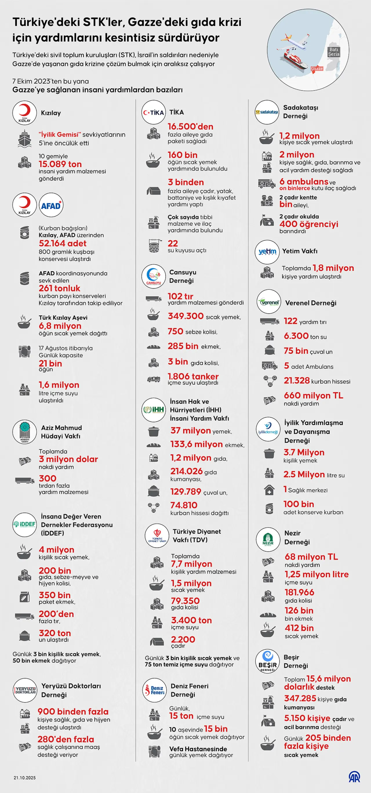 Türk Kızılay, AFAD koordinasyonuyla yürüttüğü çalışmalarda 10 gemiyle 15 bin 89 ton insani yardım malzemesini Gazze’ye gönderdi. Kızılay ayrıca 6,8 milyon öğün sıcak yemek dağıtırken, 1,6 milyon litre su ulaştırdı. AFAD üzerinden 52 bin 164 adet kurban konservesi bölgeye gönderildi.