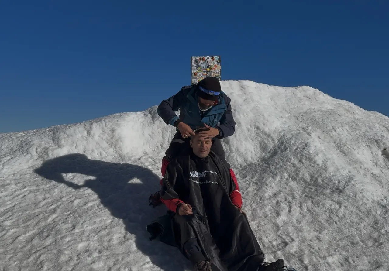 Iğdırlı berber ve dağcı Murat Akay, Ağrı Dağı’nın zirvesinde birlikte tırmandığı müşterisine 5 bin 137 metre yükseklikte tıraş hizmeti verdi. Kentte 20 yıldır berberlik mesleğini sürdüren ve Türkiye Dağcılık Federasyonu (TDF) İl Temsilciliği görevini üstlenen Akay, Ağrı Dağı’na bir tırmanış organizasyonu düzenledi. 5 kişilik ekip ile yaklaşık 3 gün süren yolculuğun ardından zirveye ulaşan Akay, yanındaki tıraş aletleriyle düzenli müşterilerinden Serkan Üç’e saç tıraşı yaptı.