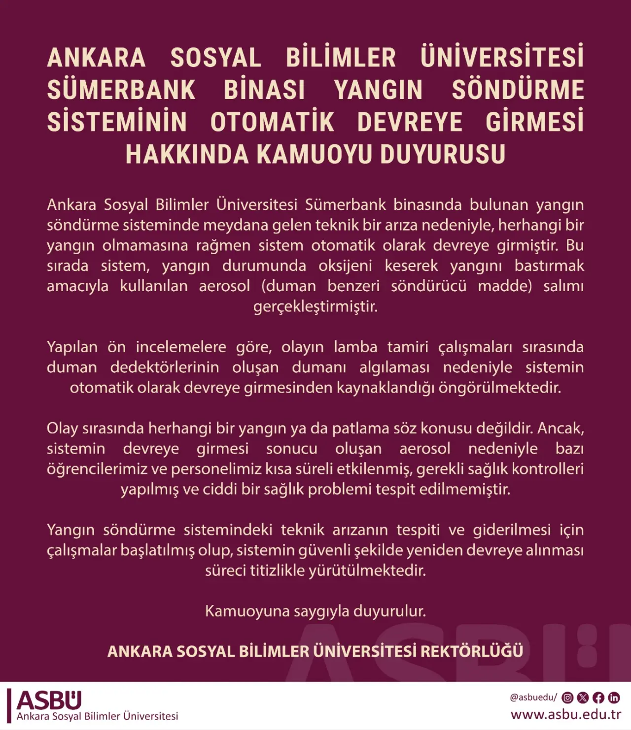 Ankara Sosyal Bilimler Üniversitesi (ASBÜ) Sümerbank binasında bulunan yangın söndürme sisteminde meydana gelen teknik arıza nedeniyle sistem, herhangi bir yangın olmamasına rağmen otomatik olarak devreye girdi.