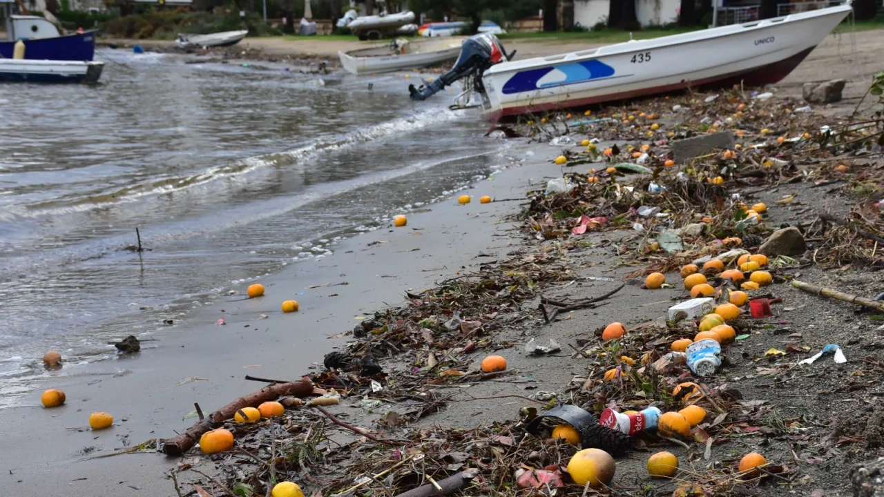 Bitez’de mandalina bahçelerinin yoğun olduğu bölgede, yağmur suyuyla derelere karışan yüzlerce mandalina dalgalarla kıyıya taşındı. Çevre sakinlerinden Orhan Ağacanoğlu,