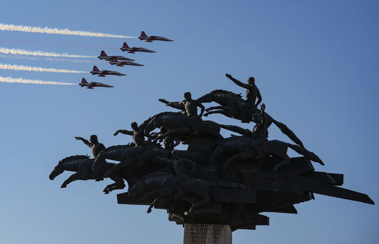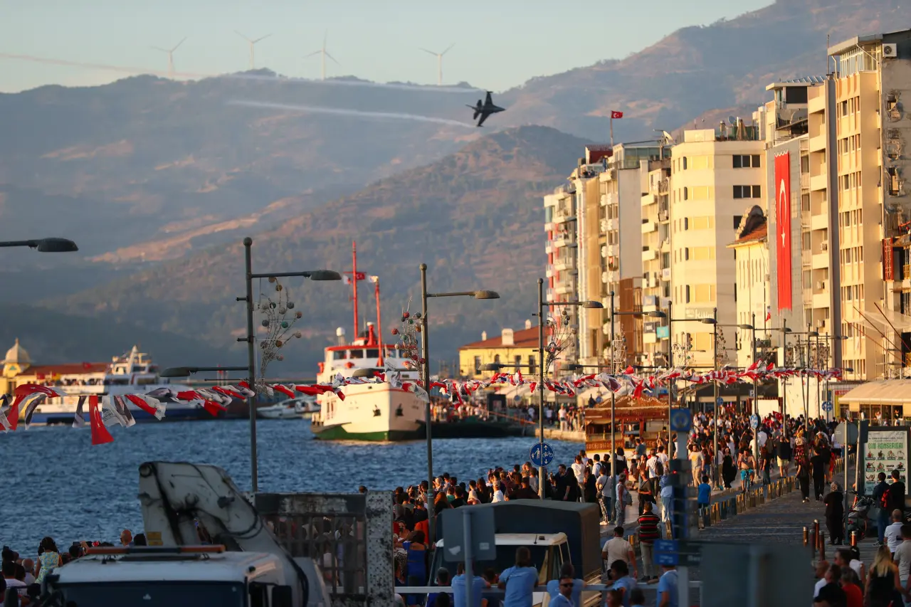 Gündoğdu Meydanı’nda bir araya gelen binlerce vatandaş, Türk Yıldızları’nın gerçekleştirdiği akrobasi gösterisini büyük bir hayranlıkla izledi.